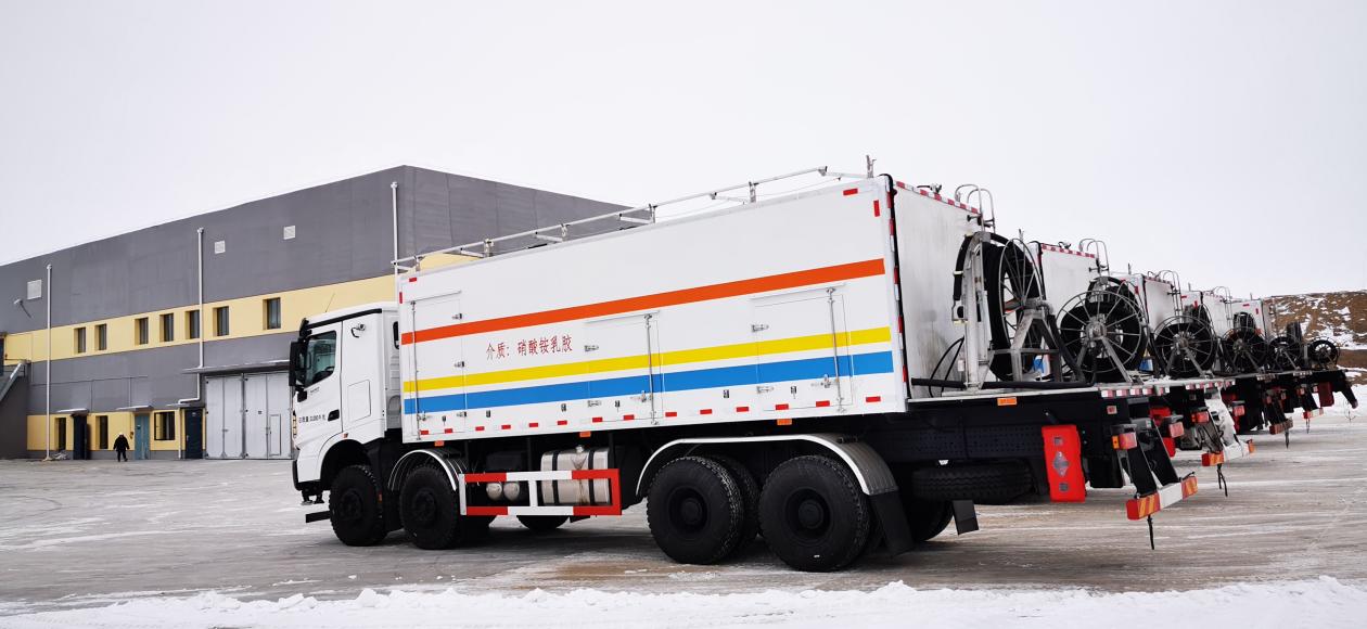 BCJ-3型现场混装乳化炸药车,可根据设计需求装载高温、常温乳化基质现场装药,也可根据爆破作业条件设计成单系统或双系统两种装药形式,满足民爆行业法规与标准要求,具有安全连锁保护技术和动态监控信息技术。混装车具备自动卷扬和旋转功能,满足多方位不同炮孔机械化装药需求,混装车运用信息化、智能化、数字化技术可实现乳化炸药基质流量检测和控制功能,闭环控制和手持终端远程无线控制。