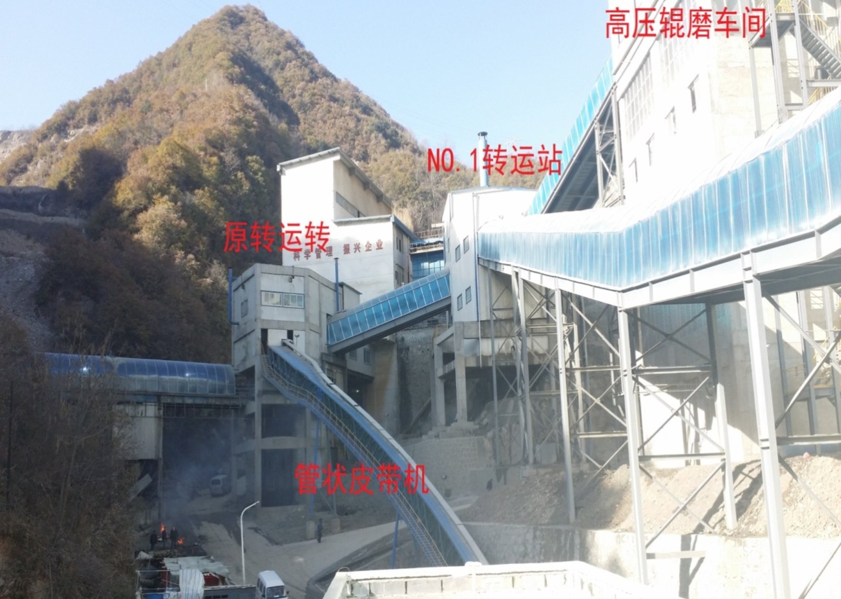 采用管状皮带机,倾角高,且能实现空间曲线布置,解决了物料输送难题;