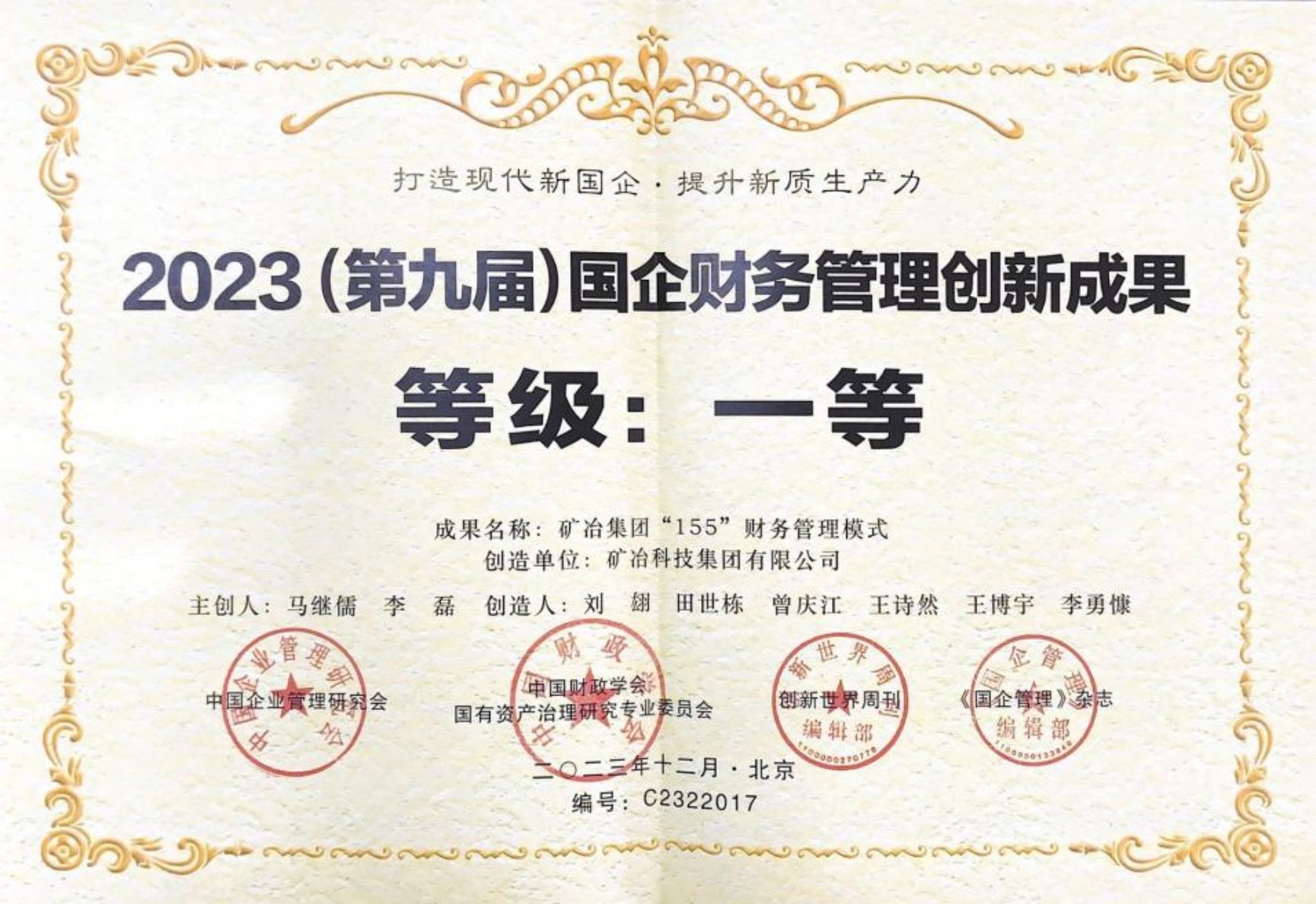 该奖项由中国企业管理研究会、中国财政学会国有资产治理研究专业委员会、《创新世界周刊》《国企管理》杂志社联合相关部门组织评选。该评选面向国有企业,总结提炼样本企业财务管理创新典型经验和做法,形成一批可复制、可推广、高质量的具有新时代特色的课题成果,为构建中国式新国企管理理论体系提供案例支撑。该奖项每年评选一次,今年是第九届,共有4110多项成果申报,经过初审、复审、答辩、调研、查实、公示、公众投票等环节,最终评选出196项获奖成果,其中一等奖34项。