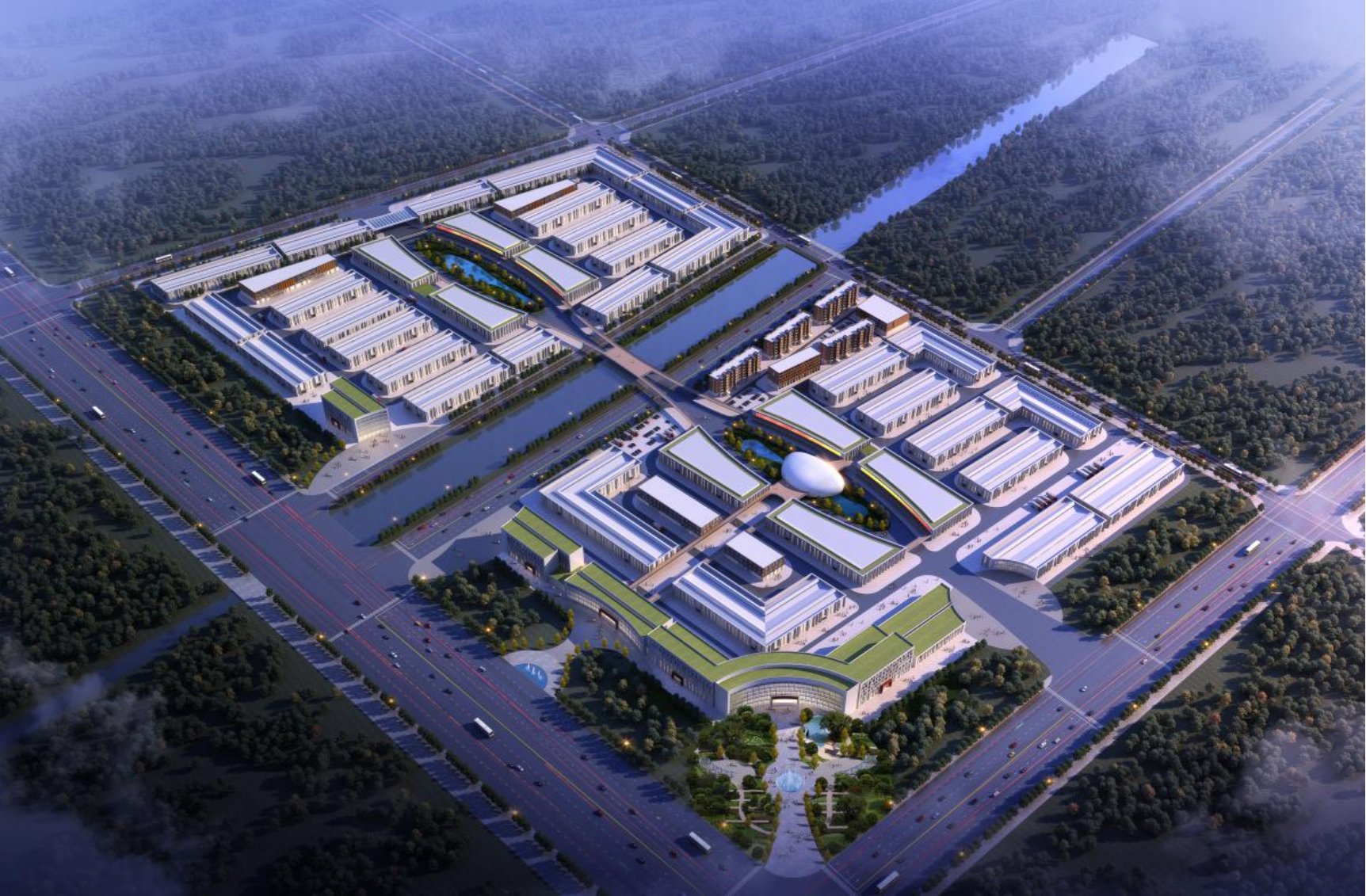 建设规模:总用地面积1883亩,总建筑面积125万平方米,功能涵盖交易中心、酒店、调度中心、检测中心、服务中心、物流库房、生产厂房、宿舍等。