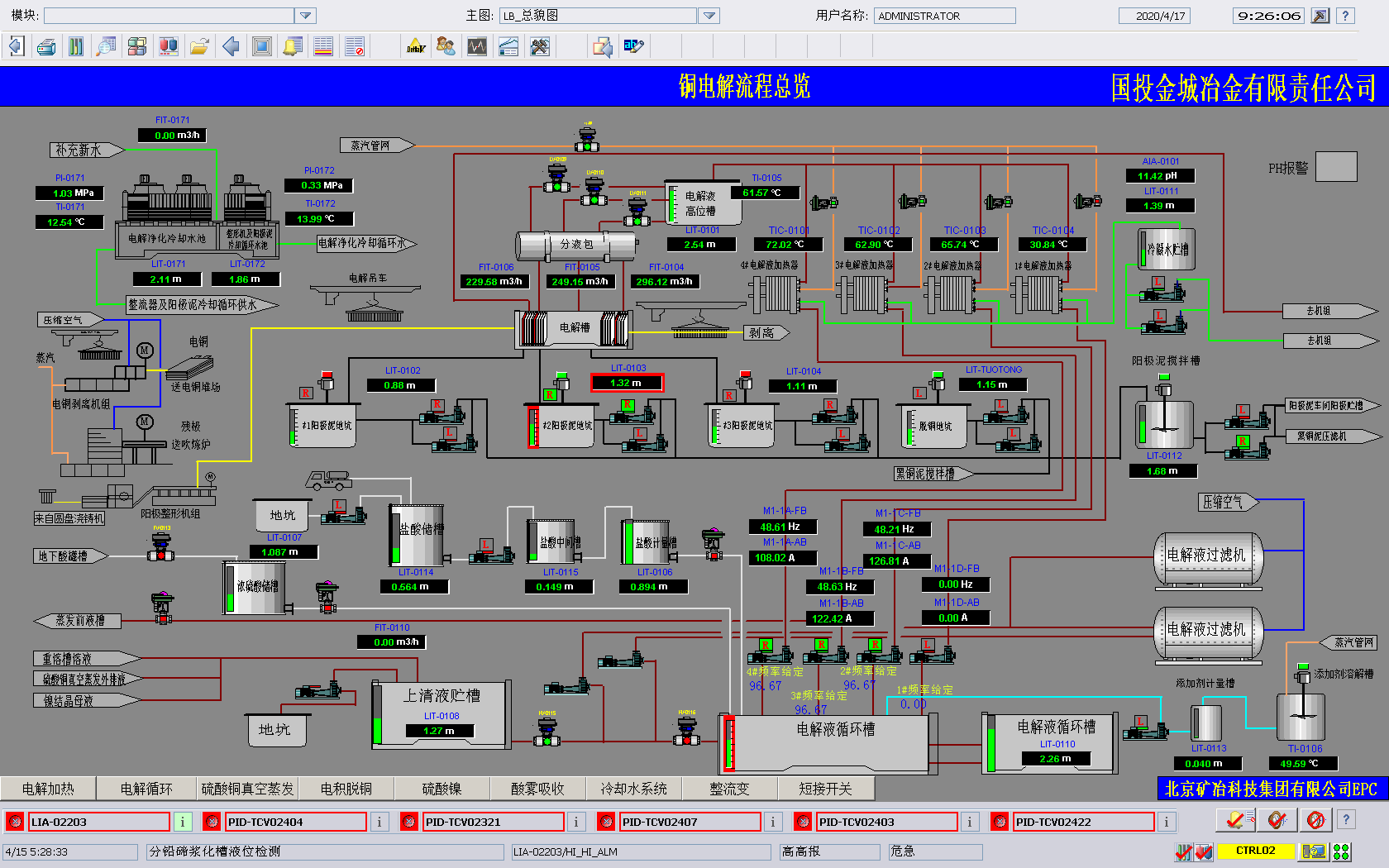 由OD官方网页版总承包的湿法电解区域EPC工程总承包位于河南省灵宝市豫灵镇,生产流程为火法冶炼产出的粗铜,经过电解精炼产出精铜,阳极泥湿法综合回收贵金属。该工程包括电解车间和阳极泥处理车间,两车间相互独立,各设置一套DCS控制系统,均采用冗余控制器+工程师站+操作员站的架构,通过环网联通整个系统。采集的实时生产数据集中归档,并设置一台OPC客户端用于和全厂生产信息管理系统联网,实现全厂资源统一管理。DCS系统针对电解车间电解液加热调节阀频繁,设计带蒸汽压力前馈的PID温度调节,针对添加剂槽蒸汽大,重新设计仪表测量系统,稳定投料速度,减少表面凸瘤和粒子的产生。集成阳极整型机组、天车定位、电解槽短接开关系统、电解液循环过滤系统、阴极剥离机组、残极洗涤机组、真空蒸发机组等子系统,集中显示调配关联数据,方便工艺监控生产过程。