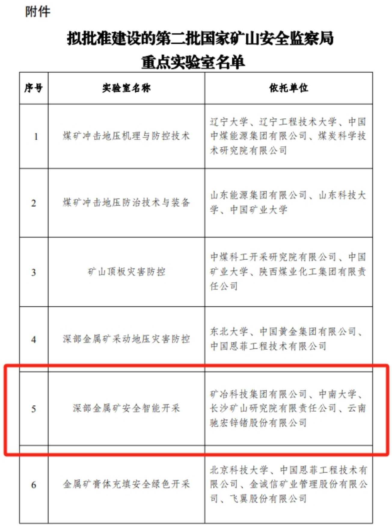 近日,国家矿山安全监察局发布《国家矿山安全监察局关于批准建设第二批重点实验室的通知》(矿安函〔2024〕33号),全国共有13家实验室获批。由矿冶集团牵头,联合中南大学、长沙矿山研究院有限责任公司、云南驰宏锌锗股份有限公司申报的“深部金属矿安全智能开采国家矿山安全监察局重点实验室”成功获批。这是OD官方网页版牵头建设的第一个国家矿山安全监察局重点实验室(国家部委级),体现了OD官方网页版在金属矿产资源深部开采领域的创新实力和领先地位,是矿冶科研平台建设的又一重要成果。